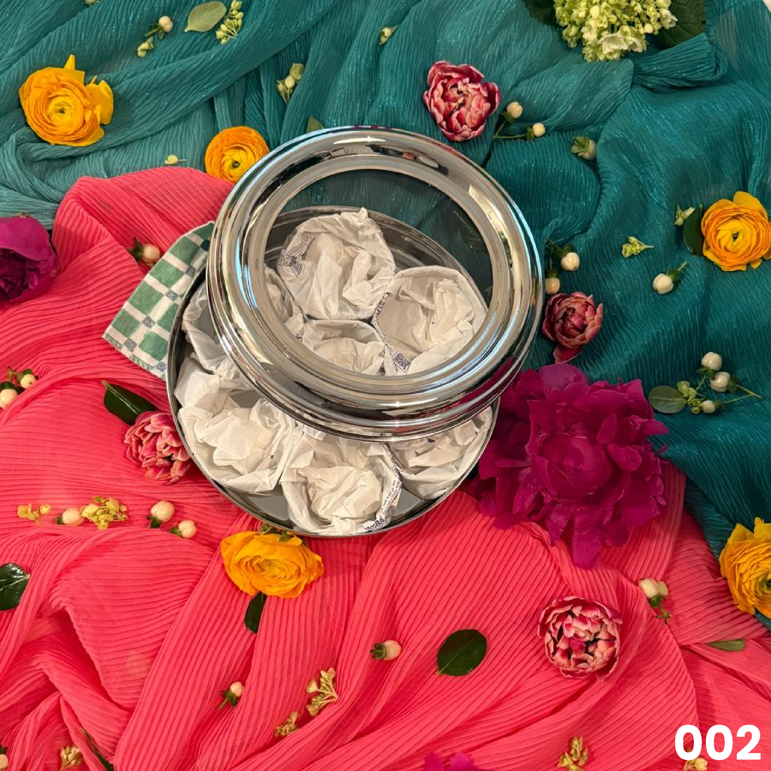It is 9” stainless steel magnificent masala dabba that has a lid with intricate floral design in both matt and glossy finish. It has 7 round cups inside for all your spice needs.